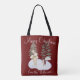 Ce sac fourre-tout de Noël ou de vacances personnalisé présente une aquarelle d'hiver chaude et confortable. Deux mignons petits animaux de forêt, un hérisson et un lapin, font du patin à glace parmi les arbres. L'arrière - plan est une riche couleur bordeaux.