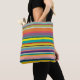 Ce sac fourre-tout a un design de rayures horizontales dans les tons bleu, vert, marron, violet, rouge, jaune, orange et rose.