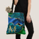 Ce sac présente un élégant et glamour arrière - plan en marbre d'agate bleu et vert avec des accents de parties scintillant faux or. Le monogramme combine écriture manuscrite et polices sans serif modernes pour un look élégant et sophistiqué. Cela fera le cadeau idéal car il peut être customisé avec un nom et une initiale. Les paillettes et la texture en mauvais état créent un mélange parfait de chic et de grunge.