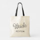 Ce sac fourre-tout moderne avec un design de calligraphie décontracté chic minimaliste lecture Bride ainsi que votre nom personnalisé dispose de lignes propres pour créer un aspect élégant et sophistiqué. Le style sobre et le petit détail imprimé du coeur d'or ajoutent une touche de sophistication à son look de jour de mariage.