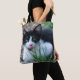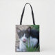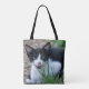 Cute chaton tuxedo noir et blanc avec la langue qui sort en se cachant derrière un bouquet d'herbe.