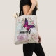 Un sac fourre-tout avec le dicton : Soyez inspiré. Inspiré écrit dans une police de script cool tendance. Conçu avec un élégant papillon magenta rose aux accents violets. L'arrière - plan est un collage vintage abîmé avec des roses roses et d'autres éléments décoratifs. Une charmante ambiance fantaisiste.