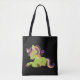 Un sac fourre-tout avec l'image d'une licorne de style Frankenstein. Couleurs violettes et vertes. Éffrayant mignon.