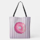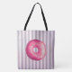 Tout le sac fourre-tout imprimé avec une illustration délicieuse d'un beigne dépoli rose avec des arroses colorées. Installé sur une motif de style vintage et vieillot, il présente des rayures violettes pastel et roses.