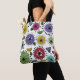 Ce sac fourre-tout a un design scandi de fleurs faites de cercles, ovales, et demi-cercles avec des éclats d'étoile sur eux et feuilles en perwinkle, jaune, vert, turquoise, magenta, rouille et bleu.