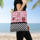 L'épaule blanche à thème Printemps / Été fourre-tout présente la moitié supérieure des fraises rouges et roses sur en vichy rose et la moitié inférieure du damier noir et blanc.