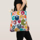 Ce sac fourre-tout a un design moderne du milieu du siècle des hexagones dans de nombreuses couleurs avec des cercles noirs et blancs à l'intérieur.