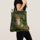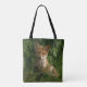 Un sac fourre-tout avec une photo montrant un mignon petit renard à fourrure rouge et blanche. Entouré de feuilles et d'herbes verdoyants.
