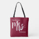 Ce sac fourre-tout bourguignon dit The Future Mrs et a un texte supplémentaire pour le nom de famille. Mme est dans un élégant script blanc. Tout le texte est blanc et peut être modifié ou supprimé.