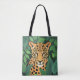 Sac fourre-tout dans un léopard avec des yeux intenses et lumineux qui s'inclinent à travers le feuillage vert luxuriant. Le contraste saisissant entre la fourrure tachetée du léopard et les feuilles vibrants crée un effet visuel saisissant.