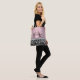 Sur ce fourre-tout élégant est une brillance métallique brossée rose chatoyante, où une lettre monogramme rose et un nom sont affichés où vous pouvez le personnaliser pour en faire votre propre, puis en dessous, c'est un groupe d'argent où il passe à un empreinte de léopard exotique en fausse fourrure noir et gris. Vibes de glamour chic animal.