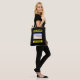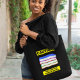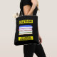 Un grand sac fourre-tout avec un message progressiste pour transporter vos livres et autres articles nécessaires. Design propose une pile de livres multicolores avec du noir sur du texte jaune qui dit "ATTENTION ! PEUT CONTENIR DES LIVRES INTERDITS".