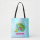 Un sac fourre-tout avec une jolie illustration d'un lézard tropical vert entouré de feuilles et de fleurs de couleur bleu turquoise derrière l'image. Personnalisez avec un nom.