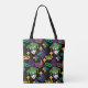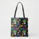 Sac fourre-tout carnaval Mardi gras à motifs de masques de visage carnavaleux, motifs de fleur de lis et masques de jester en violet, vert et or sur noir