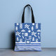 Monogramme Abstrait Geometry Bird Floral Blue Girly Chic Sac fourre-tout dispose d'un design moderne abstrait bleu et blanc super géométrique, rétro matisse floral avec arcs-en-ciel et oiseaux en bleu et blanc avec votre monogramme personnalisé ci-dessous. Parfait pour l'anniversaire, la fête des mères, les cadeaux de Noël, les célébrations et plus encore. Créé par Evco Studio www.zazzle.com/store/evcostudio