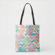 Ce sac fourre-tout élégant pour elle présente des faux parties scintillant, des coquillages colorés dans de multiples couleurs de turquoise, de rose corail, d'aqua et d'or. Les coquilles sont placées sur des rayures de chevrons bleu aqua qui contiennent également des images du motif de coquille, et celles-ci sont contrastées avec des rayures de chevrons blancs. Les deux côtés du sac ont la même image.