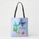 Beau papillons multicolores sur Sac fourre-tout bleu clair. Le texte peut être personnalisé. Des femmes élégantes font des courses de sacs.