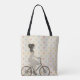 Cadeaux et accessoires chics et modernes, personnalisés avec une fille élégante montant une bicyclette avec la serviette d'Eiffel à l'arrière-plan. Décoré d'un motif de point multicolore de polka.