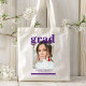 Photo Graduation Party Élégant Sac fourre-tout de script moderne avec votre photo préférée avec le simple texte violet "Grad (année)" et votre nom et les détails de graduation personnalisée sur le devant. Idéal pour les grands comme cadeau de remise de diplômes ou décoration de fête de remise de diplômes. Créé par ©2023 Evco Studio www.zazzle.com/store/evcostudio