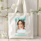 Photo Graduation Party Élégant Sac fourre-tout de script moderne avec votre photo préférée avec le texte simple turquoise "Grad (année)" et votre nom et les détails de graduation personnalisée sur le devant. Idéal pour les grands comme cadeau de remise de diplômes ou décoration de fête de remise de diplômes. Créé par ©2023 Evco Studio www.zazzle.com/store/evcostudio