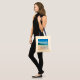 Un sac fourre-tout avec une photo d'un magnifique lieu de vacances. Ciel bleu vif, plage de sable doux avec eaux cristallines cristallines bleu tropical. Une montagne couverte d'arbres luxuriants dans l'arrière - plan. Photographie pittoresque et tranquille.