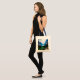 Un sac fourre-tout en toile avec une belle photographie d'une scène nature agréable et tranquille. Forêt verdoyante à l'avant et montagnes bleues à l'arrière. Avec un ciel blanc nuageux et onirique. Ambiance mélancolique et magique.