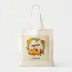 Un sac fourre-tout de toile personnalisé avec un mignon écureuil debout derrière quelques citrouilles orange aquarelle. Une couronne de feuillage les entoure d'une feuille de chêne et de fleurs d'orange et d'autres sprigs et feuilles. Arrière - plan est un parchemin faux vintage couleur crème, à l'aspect vieillot.