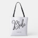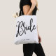 Ce sac fourre-tout élégant présente un script manuscrit noir moderne et dit "mariée", avec un endroit pour ajouter votre nom.