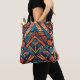 Motif abstrait sans soudure aux formes géométriques dans les tons orange, bleu et noir. Le design présente différentes formes triangulaires et angulaires disposées dans une disposition répétitive et symétrique. L'esthétique générale a un sac fourre-tout audacieux, tribal ou ethnique