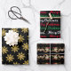 Les trois designs sont placés sur un arrière - plan noir, donnant à vos cadeaux emballés "Une Touche de Classe". Le premier motif est constitué d'un flocon de neige doré. La feuille suivante a un motif composé des mots Joyeux Noël, en blanc, rouge et vert. Et le dernier design est un motif d'ornements en miroir.