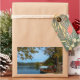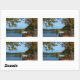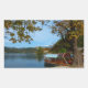 Rechteckiger Aufkleber mit bunten Fotos im Bled-See unter einem Kastanienbaum in Herbstfarben in einer Herbstlandschaft in Slowenien.