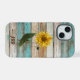 Cet iphone de jardin de campagne et coque Samsung dispose d'un tournesol doré contre le bois vert et brun faux patiné. Cette charmante conception de saumons boho comprend vos initiales monogrammes en marron en bas. Tapez-les dans la zone Personnaliser pour remplacer l'espace réservé.