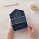 Elégante soirée de 50ème anniversaire bleu marine foncé sur invitation avec "cinquante" dans un script chic, votre nom dans la typographie serif classique, les détails de la fête en lettres simples, et une carte de réponse RSVP déchirante, le tout rendu dans votre choix d'or, argent ou feuille d'or rose.