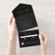Invitación de boda todo en uno en elegante color negro, con texto en dorado metálico prensado que resalta “Nuestra Boda” y los nombres de los novios. Incluye una tarjeta RSVP desprendible en la parte inferior. Un diseño moderno y práctico, completamente en español.