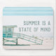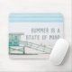 Emotive Abbildung eines Schutzturms am weißen Sandstrand mit Zitat "Der Sommer ist ein Staat des Geistes" auf dem Mauspad, um Positivität während der Arbeit inspirieren.