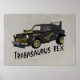 Ein computergeneriertes, schwarzes und goldenes Bild eines maßgeschneiderten DDR Trabant Automobils. Der Spitzname des Personenkraftwagens, Trabasaurus rex, erscheint in einem geeigneten Schriftart sowohl an der Fahrzeugtür als auch unter dem Bild. Das Fahrzeug trägt ein Idaho-Nummernschild mit dem Aufdruck "TRABI REX", das von den mythischen Warschauer Pakt Wonder Wheels (Classic Commie Cars) in Sandpoint angepasst wurde. Die Trabant war das Volkswagen der DDR "Trabant" bedeutet reisende Begleiter und wurde durch das russische Wort "sputnik" mit der gleichen Bedeutung inspiriert. Über 3 Millionen Trabants wurden in der Zeitspanne von 30 Jahren produziert. Der Motor des Trabant war untertrieben, ineffizient und verursachte eine große Verschmutzung. Der viel geschmähte Trabant, oder Trabi, wie es allgemein bekannt war, war lange der Hintern von Witzen, aber in den letzten Jahren trendy geworden. Einige wurden in die Vereinigten Staaten eingeführt. Dach, Kofferraumdeckel, Kapuze, Fender und Türen wurden mit Duroplast, einem harten Kunststoff ähnlich Bakelit, aus gerecycelt Werkstoffen hergestellt: Baumwollabfall aus der sowjetischen Gewerkschaft und Phenolharze aus der ostdeutschen Farbstoffindustrie. Dies machte den Trabant zum ersten Wagen mit einem Körper aus gerecycelt Material und war zum Teil verantwortlich für die falsche Vorstellung, dass es aus Pappe gemacht wurde. Verschiedene Crash-Testergebnisse zeigten, dass sie besser abliefen als vergleichbare Schlupflöcher für zeitgenössische Western.