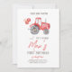 Cette invitation d'anniversaire comporte un joli tracteur rouge avec des ballons colorés derrière, et le nom affiché en grandes lettres joyeuses. Il s'agit d'amusement et d'excitation pour le prochain panier d'anniversaire sur le thème du tracteur à la campagne!