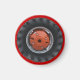 Photo du pneu tracteur à moyeu rouge sur un arrière - plan bordeaux. Image copyright 2012 par Margaret E. Cmelik.