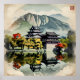 This serene watercolor-style painting features a majestic Japanese castle nestled beside a tranquil lake, surrounded by lush summer foliage. Soft green mountains rise in the background, while vibrant touches of red and gold hint at seasonal change. The castle’s elegant multi-tiered rooftops reflect beautifully in the still water below, creating a peaceful, immersive landscape. Perfect for lovers of Japanese architecture, nature scenes, and calming wall art.