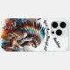 Indische Indianerin mit traditioneller Kleidung. Ihr ruhiger Ausdruck wird durch eine lebendige Feder unterstrichen, umgeben von einer Mischung aus erdigen Farben und Mustern.