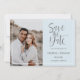 Elegantes Foto Save the Date, mit Ihrem Lieblings-Verlobung senkrechten Foto auf der links Seite, mit Ihren Hochzeitsdetails auf der rechten Seite, umgeben von weißem Rum. "Save the Date" erscheint in weißer Schrift Typografie über einem blassblauen Hintergrund. Fügen Sie Ihren Namen und Ihre Details mit der Vorlage hinzu, die Karte kehrt zu einer passenden hellblauen Farbe mit Platz für zusätzlichen Text zurück.