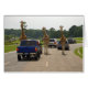 Photo amusante avec la marche de trois girafes au milieu de la route.