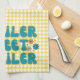 Niedliche Küchenhandtücher für alle, die das Leben des Anhängers genießen! Aqua-Text "Anhänger süß" mit zusätzlichen Blume auf gelbem Harlequin-Muster-Hintergrund