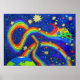 Un arc-en-ciel coloré quitte le globe et disparaît dans l'espace bleu, se transformant en boules d'espace et étoiles.