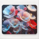 Eine Sammlung stilisierter Pappkuchen mit durchsichtigen Blütenblättern in Blau, Rot und Weiß auf schwarzem Hintergrund