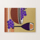 Puzzle in einem modernen Boho Stil, minimalistische Abbildung von Trauben in einer Maronschale, mit einem Glas Wein, auf einem gestreiften Tischdecken in Erdfarben von Bräune und Terrakotta