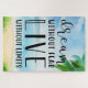 Wasserfarbener tropischer Strandhintergrund mit Texteüberlagerung.