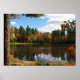 Dieses hübsche, kunstvoll gestaltete Reiseplakat besticht durch eine junge Frau, die auf dem Dock am Rande eines großen Teiches in Neuengland sitzt und träumt. Der Herbst ist in der Luft. Das Wasser ist von Bäumen umgeben, die in prächtigen, gelben, grünen, roten, orangefarbenen und goldenen Farbtönen gestaltet sind. Der blaue Himmel hat flauschige weiße Wolken und all dies spiegelt sich im Wasser wider. Der Kofferraum eines großen Kiefernbaums bestimmt die links Seite. Die brillante Sonne spiegelt sich in ihrem roten Haar wider.