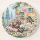 Ein junges Mädchen mit bunten Blume in ihren Haaren schläft friedlich vor einem skurrilen Haus aus verschiedenen bunten Papierschrotten. Bäume schwirren und blühende Blume umgeben die Szene und schaffen eine traumhafte Atmosphäre. Digitale Kunstfotografie CS5