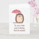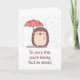 Eine Abschiedskarte mit einem niedlichen, aber traurigen Igel, der im Regen einen trüben Regenschirm hält. Perfekt als Abschiedskarte für verlassend Kollegen, Freunde, die an andere Orte ziehen usw.